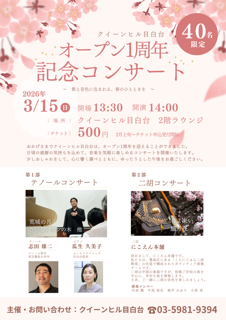 「クイーンヒル目白台オープン1周年記念コンサート」につきまして、詳しくは、リーフレットをご覧ください。